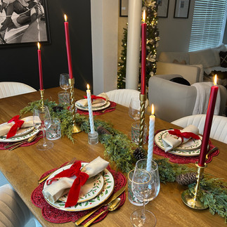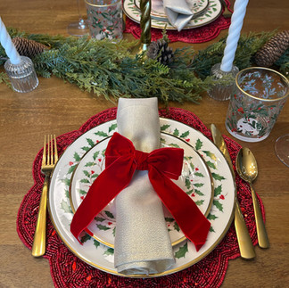 Find the Lenox dishes, silverware, napkins, and candles all from Amazon! The beautiful velvet bow napkin rings came from Williams Sonoma. I reccomend checking out your local Homegoods for the placemats and more candle holder options. Lastly, the garland down the center of the table is from Michaels, however Hobby Lobby always has amazing garland options. I normally look for a softer garland for the table thats a cedar!